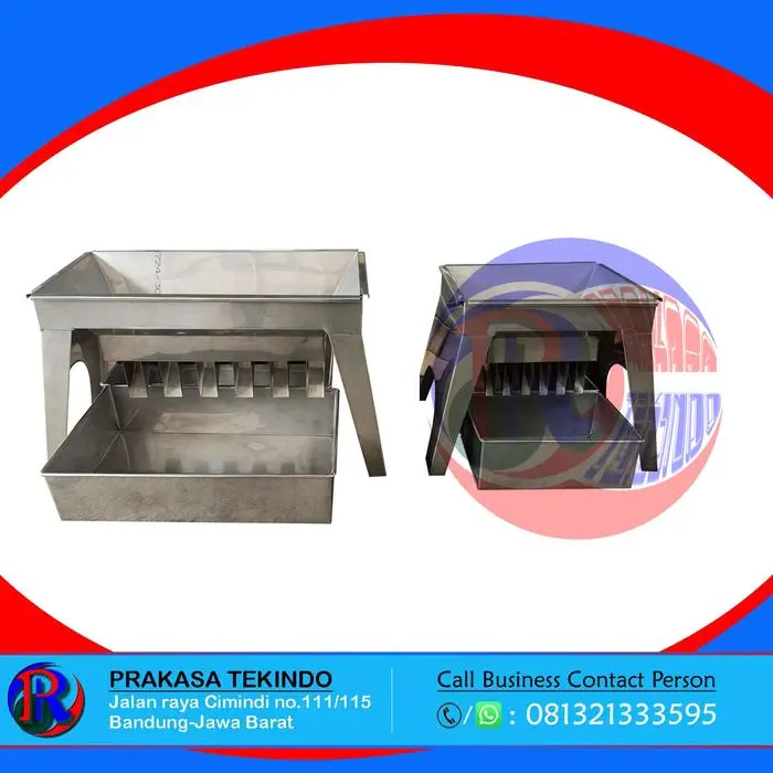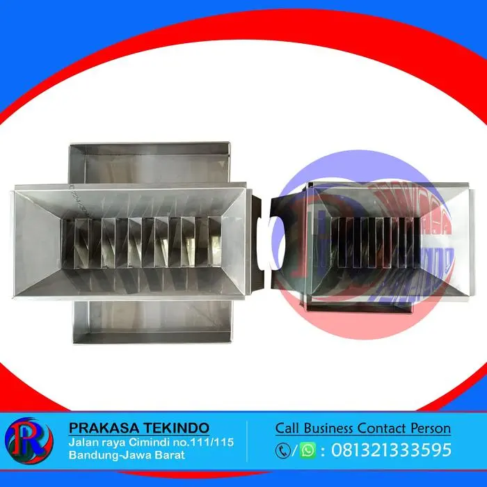 Sample Splitter material – Stainless steel ukuran : # chute width 1/2 #34;, 12 holes, # chute width 3/4 #34;, 12 holes, # chute width 1 #34;, 12 holes, # chute width 1-1/2 #34;, 12 holes, # chute width 3 #34;, 8 holes, # chute width 2 #34;, 8 holes, # chute width 10mm, 16 holes, bisa custom lubang dan banyaknya lubang.